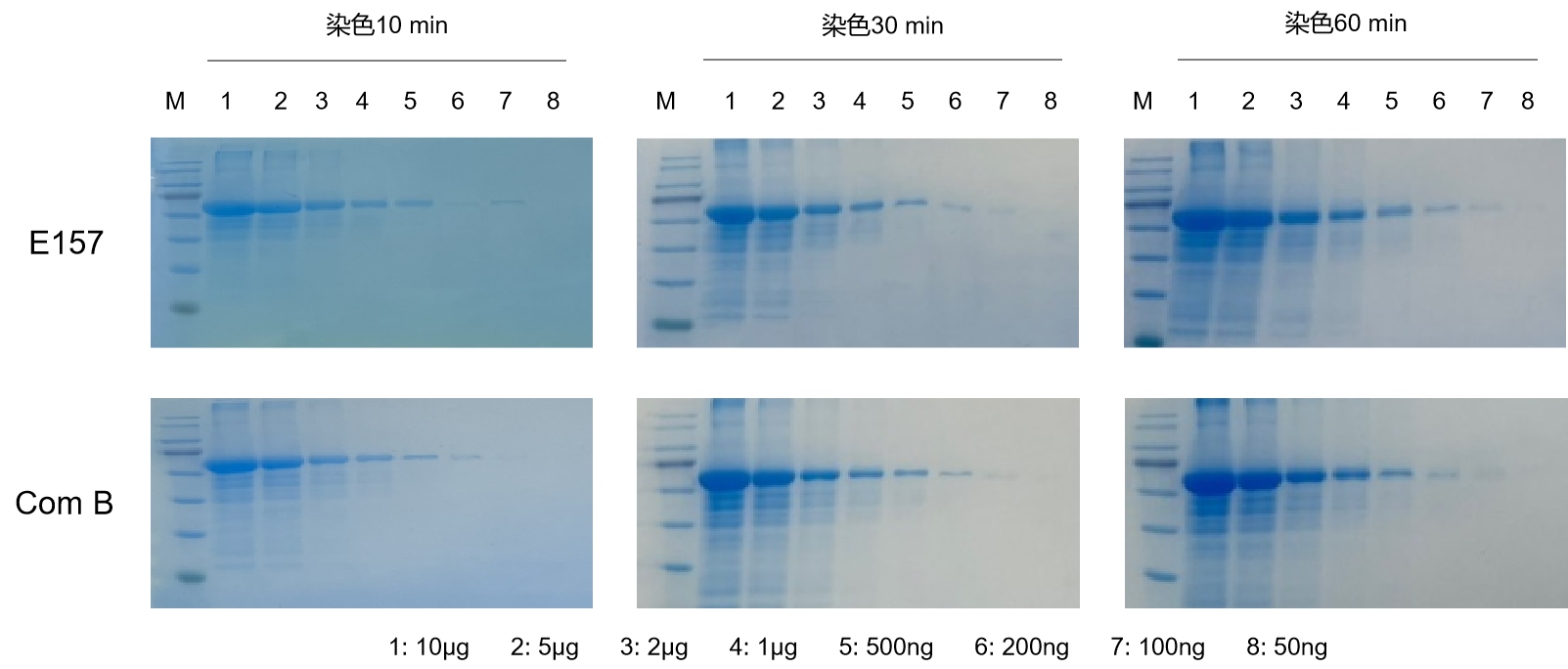 不同蛋白上樣量,經(jīng)不同時間染色及脫色后,可看到清晰的目標蛋白條帶。結果顯示,E157 在 10 min 時可見 200 ng 條帶,30 min可見 100 ng 條帶,60 min 可見低至50 ng條帶,因此,E157染色速度快、靈敏度高。