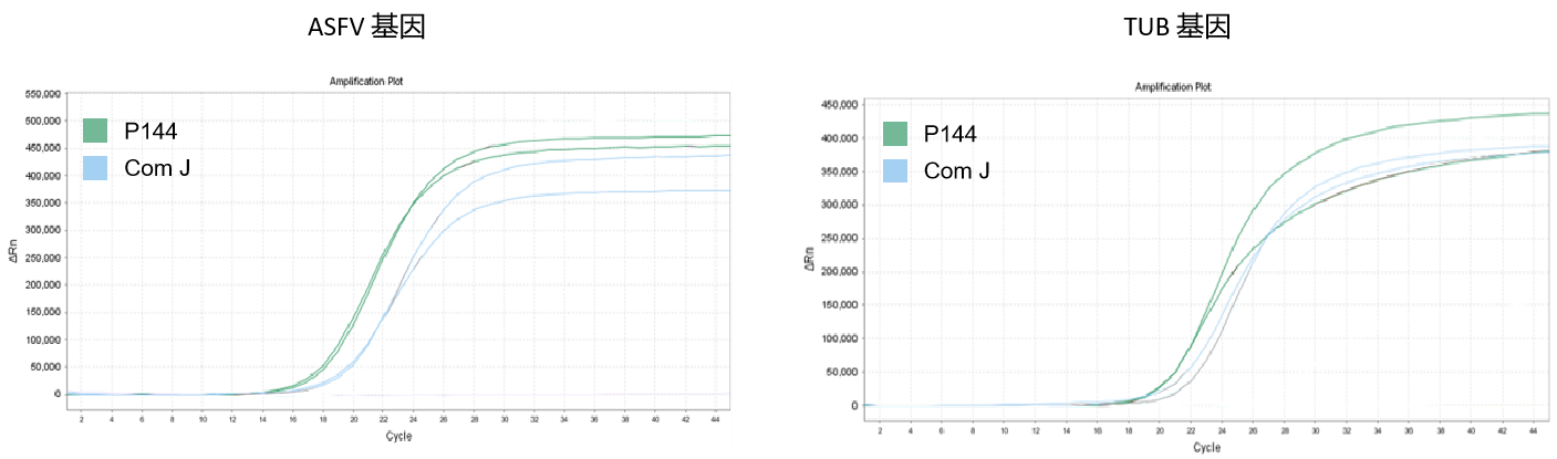 以 50 mg 含有非瘟病毒(ASFV)的豬肉組織為樣品,使用 GenStar #P144 和 Com J,室溫孵育 5 min 后進行核酸提取,提取后進行 qPCR 檢測。結(jié)果顯示,P144 提取效率高,且優(yōu)于 Com J。
