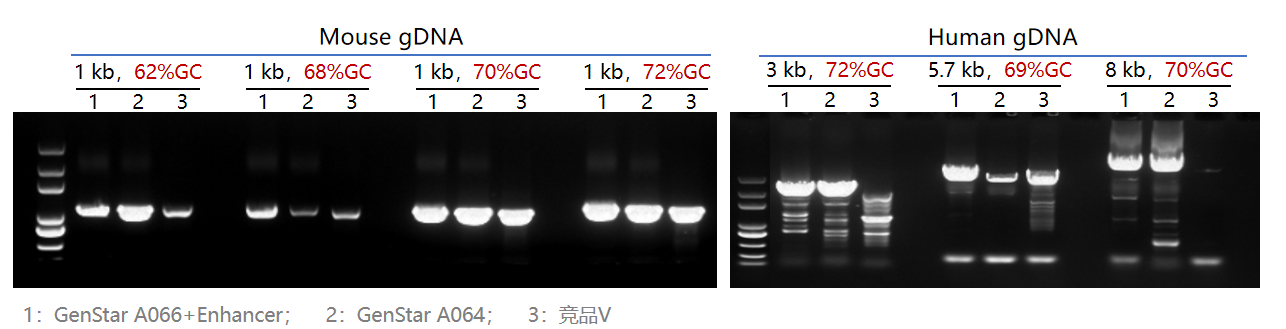 以 Mouse、Human gDNA 為模板,使用 GenStar A066 和 GenStar A064、競品 V 分別擴(kuò)增不同 GC 含量的目標(biāo)片段。
